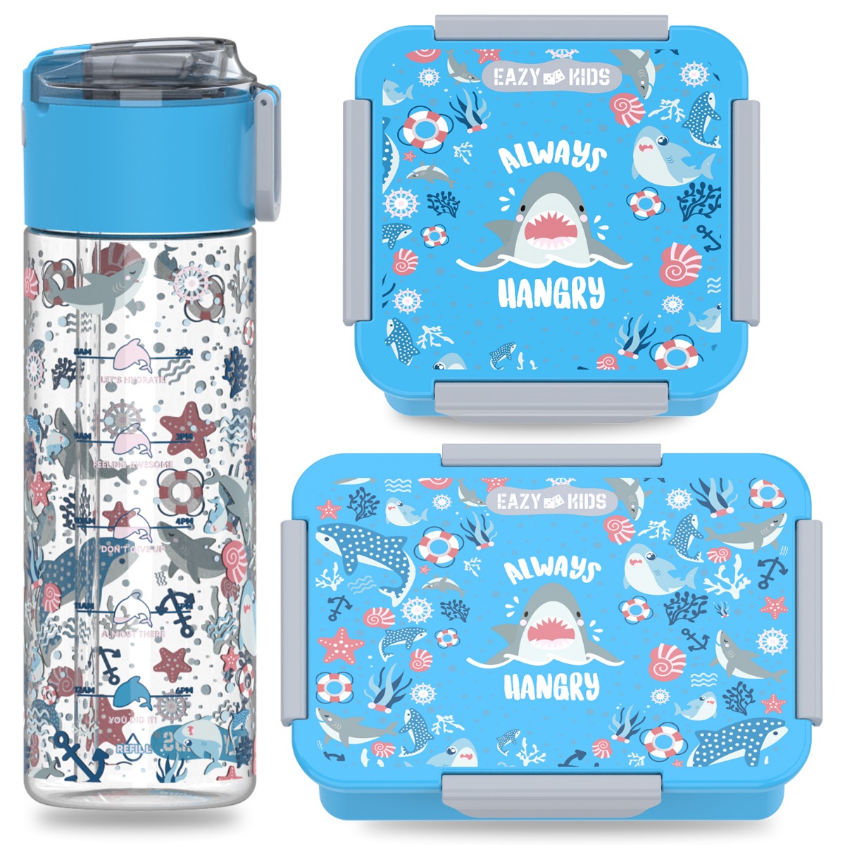 Eazy Kids Lunch Box Set and Tritan Water Bottle w/ Snack Box, Shark - Blue, 450ml
